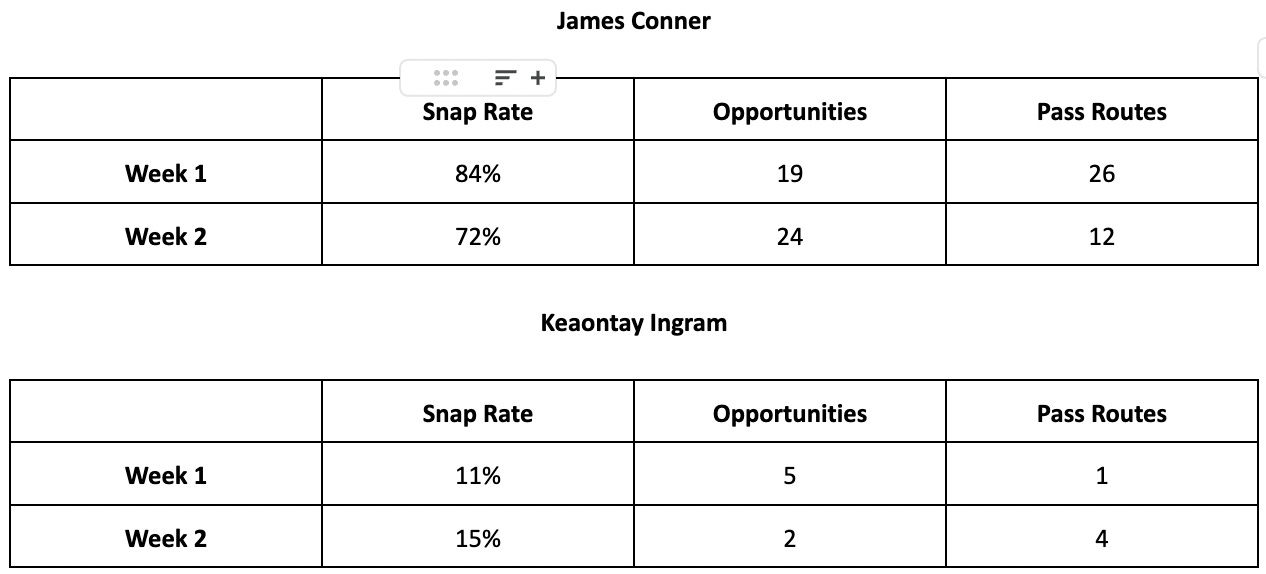 Analysis: Only Christian McCaffrey (50), Tony Pollard (50), and Derrick Henry (47) have seen more opportunities than Conner’s 43 through two weeks. Conner was in positive game script for the entirety of Week 2. The Cardinals appear ready to ride Conner as far as he’ll take them offensively. He’s unlikely to see the amount of scoring chances he has in the past, but Conner has proven he can convert the ones he gets. Conner is a rock-solid, steady RB2.
