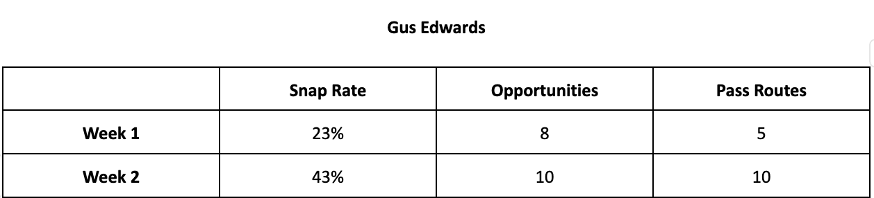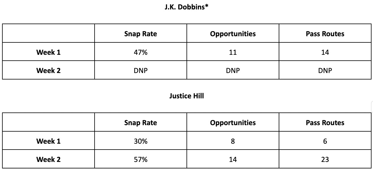 Analysis: Dobbins is done for the season after tearing his Achilles’ in the Week 1 opener. Hill made the Week 2 start and led the duo in snaps, opportunities, and routes, but Edwards did more with his carries, going 10/62/1 to Hill’s 11/41/0. Hill out-targeted Edwards 3 to 0. Both have RB3/FLEX appeal and should be owned everywhere.