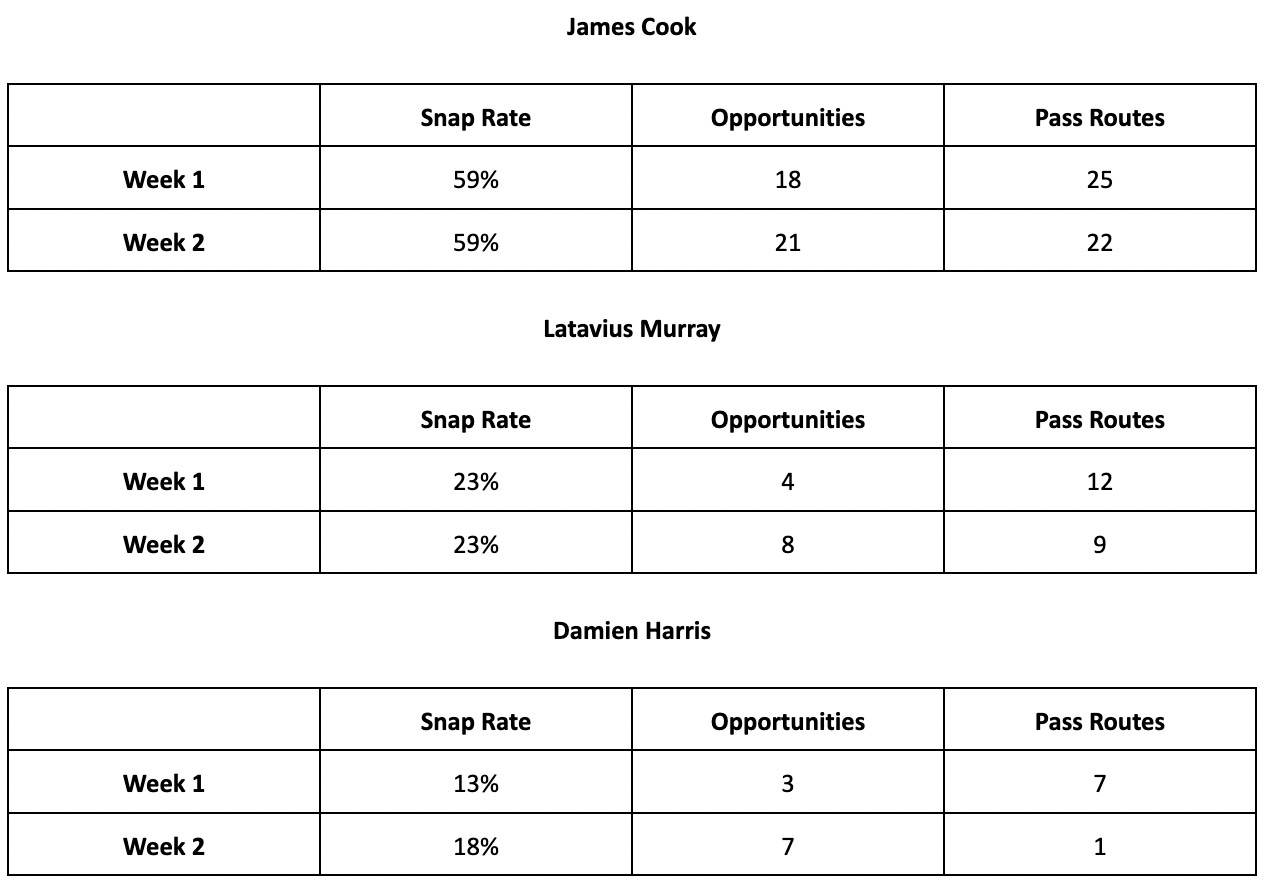 Analysis: Cook looks locked in as an every-week, big-play fantasy RB2, though his overall TD upside is capped with Allen, Harris, and Murray getting the to-date scoring looks. And it even looks like Murray might be the preferred two-minute and hurry-up back thanks to his pass-blocking acumen. Cook has a wide range of weekly outcomes.