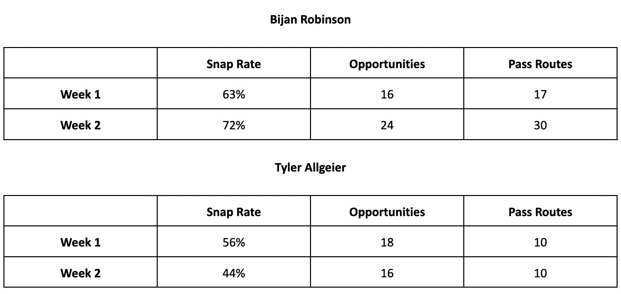 Analysis: The Falcons have settled on Robinson as the passing-game specialist with Allgeier getting most of the scoring looks at the goal line. In an offense that wants to run it as much, or more, than any other team, both Robinson and Allgeier are surefire fantasy starters. Robinson is the better bet for catches and big plays and leads the team with a 22% target share while Allgeier could pace the duo in money touches at the goal line. Atlanta has shown a willingness to put both backs on the field together.